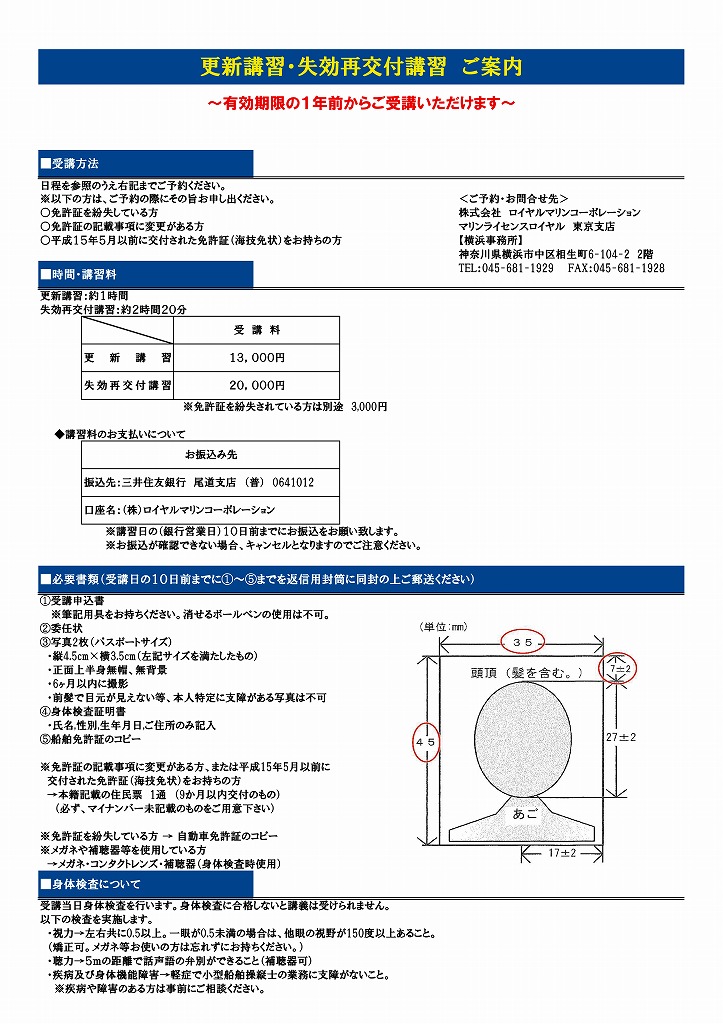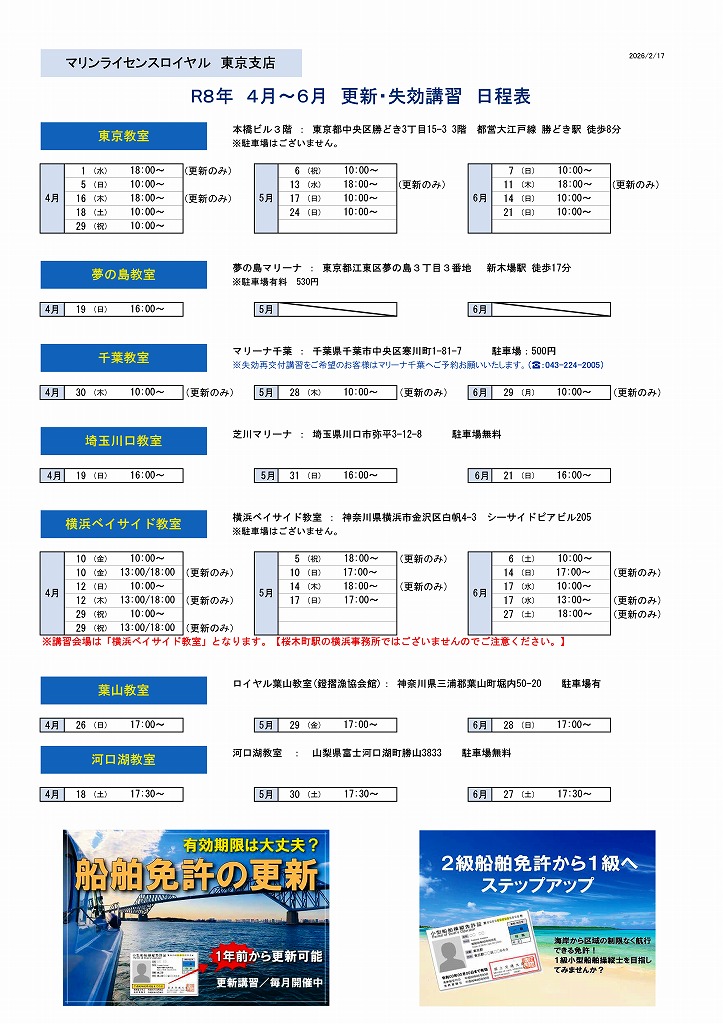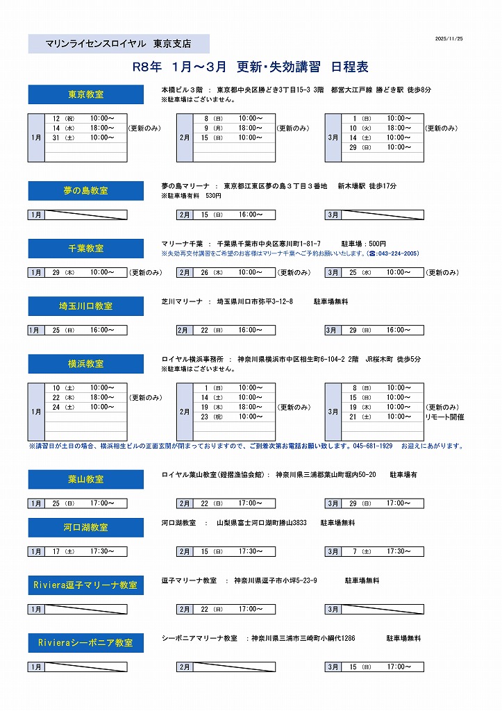 東京教室・千葉教室・埼玉教室・横浜教室・葉山教室・河口湖教室・Riviera逗子教室における【船舶免許の更新・失効再交付講習】の日程をお知らせさせて頂きます。ホームページに順次掲載してまいります、掲載が無い場合はお電話にてお問合せください。
