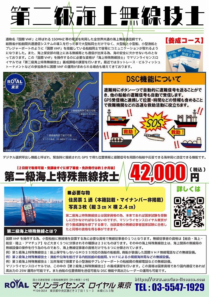 マリンライセンスロイヤル東京では、東京都中央区勝どきのマリンライセンスロイヤル東京教室にて「第2級海上特殊無線技士」養成課程講習を定期的に開催しております。