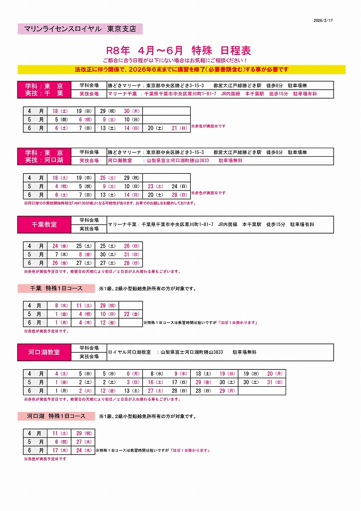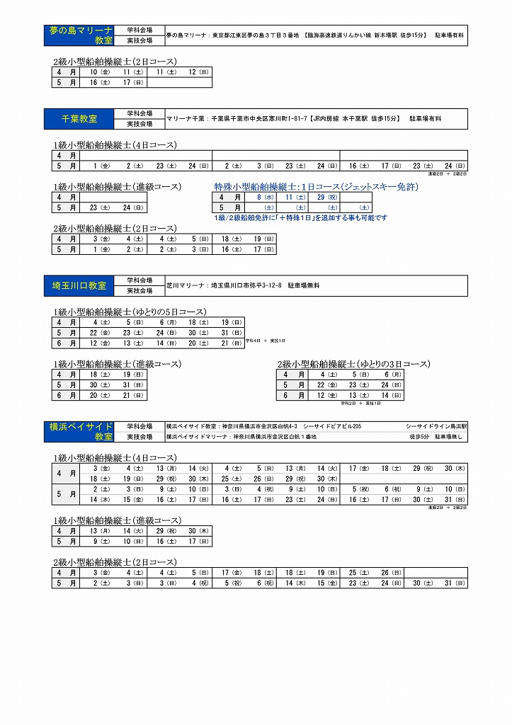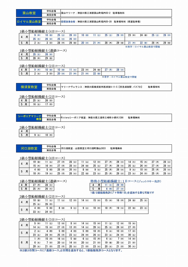 | ジェットスキー免許(2026・4月~6月)日程 |
