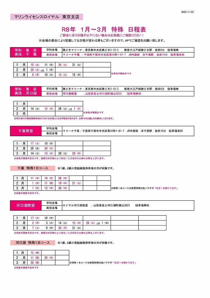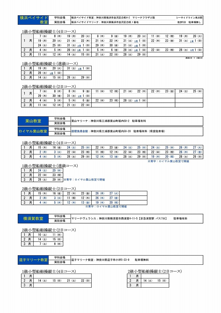 東京教室・夢の島教室・千葉教室・埼玉教室・横浜ベイサイド教室・葉山教室・河口湖教室・横須賀教室・真鶴教室・Riviera逗子教室・熱海教室の【1級船舶免許・2級船舶免許・進級/ステップアップ】の日程をお知らせさせて頂きます。ホームページに順次掲載してまいります、掲載が無い場合はお電話にてお問合せください。