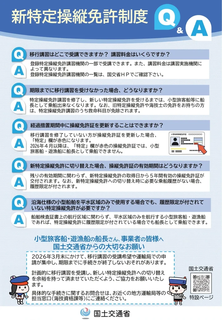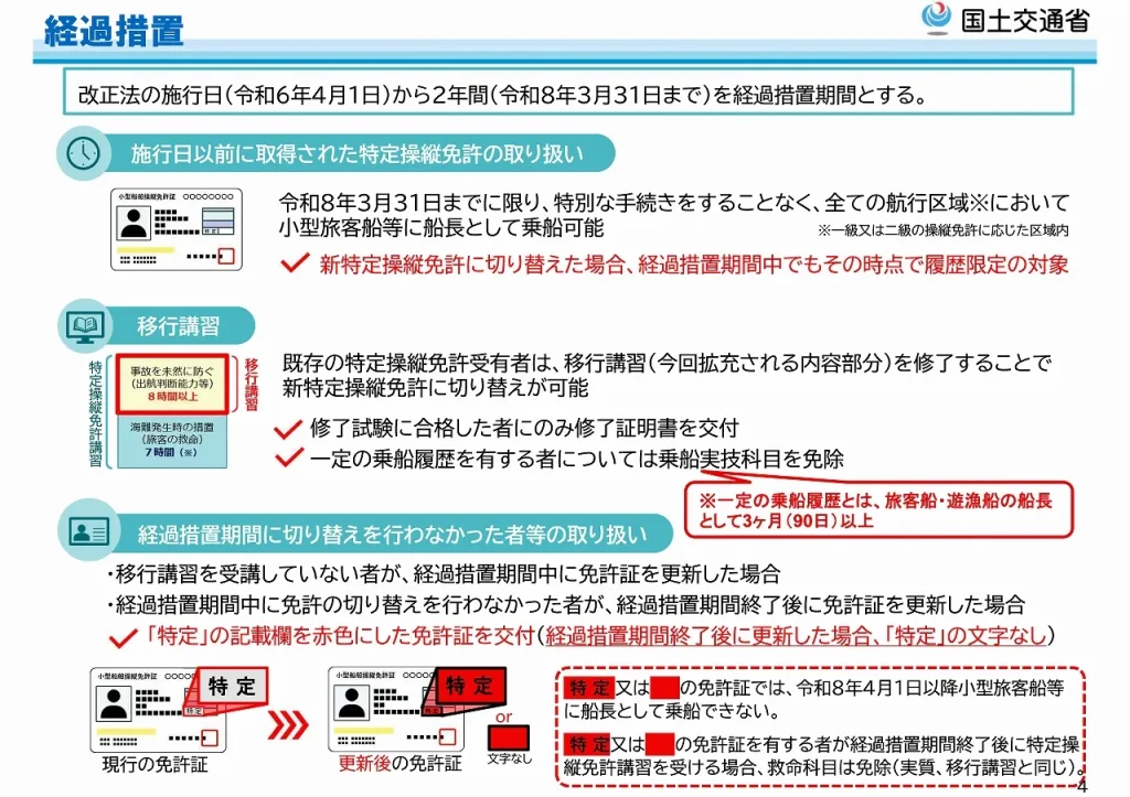 2024年3月31までに特定操縦免許を取得された方は、経過措置として2026年3月31日までは特別な手続きをすることなく、引き続き小型旅客船、遊漁船に船長として乗船が可能ですが、2026年4月1日以降も小型旅客船、遊漁船に船長として乗船する場合は、新しい特定操縦免許が必要になります。