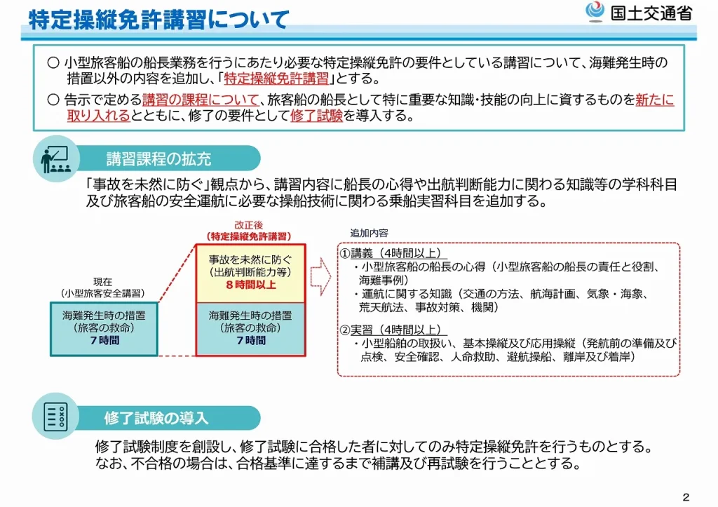 2024年4月1日以降に人の運送(旅客船や遊漁船など)を行う目的で、小型船舶を船長として操縦する場合は、1級小型船舶免許または2級小型船舶免許の他に、新しい制度による「特定操縦免許」が必要となり、特定操縦免許を取得する為には、特定操縦免許講習の受講が必要です。