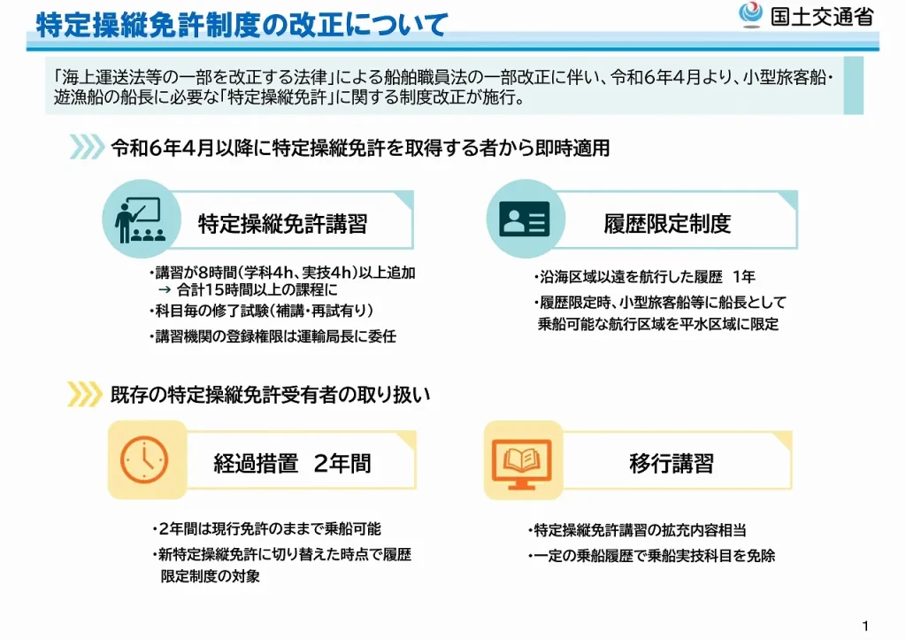船舶職員及び小型船舶操縦者法の改正により、2024年4月から特定操縦免許制度が変わりました。