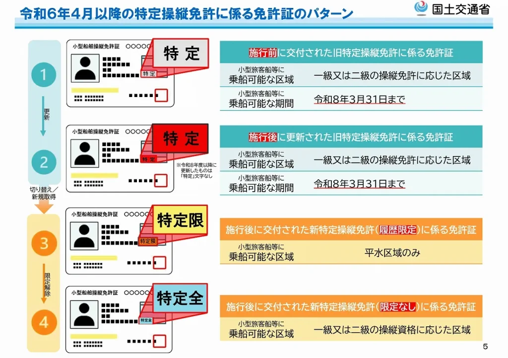 | A: | 移行講習を修了していない方が操縦免許証を更新した場合、免許証の「特定」欄が赤色になります。2026年4月以降は「特定」欄が赤色の操縦免許証では、小型旅客船・遊漁船に船長として乗船することはできません。 |