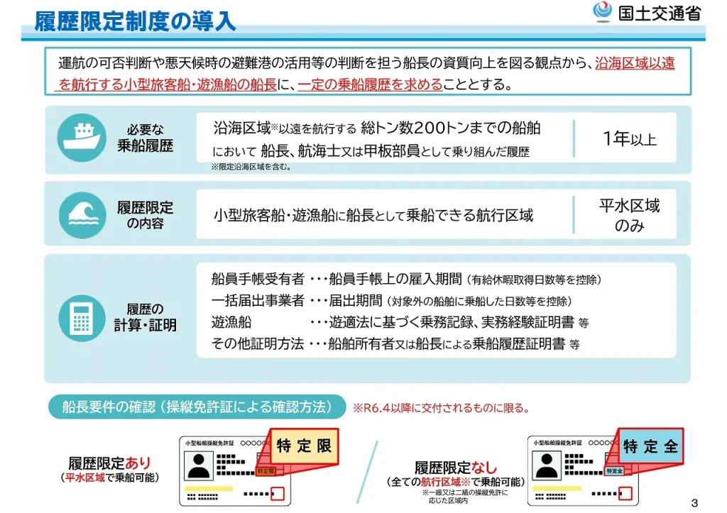 新しい制度による特定操縦免許は、一定の乗船履歴がない場合「特定限」の免許が交付され、小型旅客船・遊漁船に船長として乗船できる航行区域が、平水区域に限定されます。