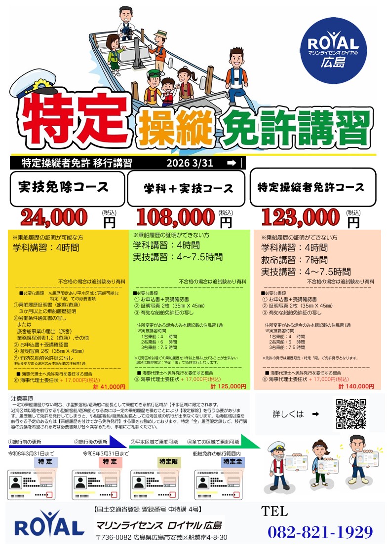 マリンライセンスロイヤル広島では広島と岡山で特定操縦免許の移行講習を開催しています。